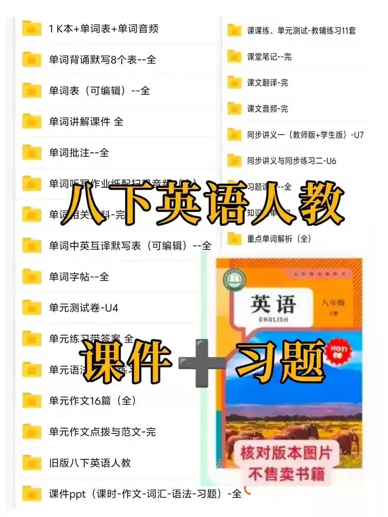 内容包含:教案、课件PPT、电子教案、同步讲义、音频MP3、知识清单、单词详解、默写表、单元测试等,持续更新,初二下学期适用,资料齐全,方便自学、复习、打印。