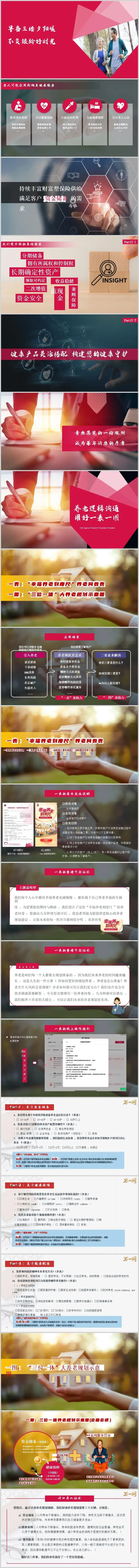 核心目的: 通过客户的答案,判断其对养老的认知水平、资金准备情况、风险关注点以及服务偏好,为后续导入“三位一体”的解决方案铺平道路。