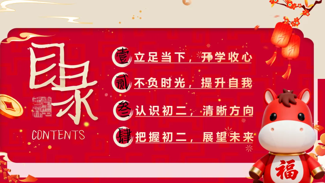 “青春不负好时光,初二扬帆再启航”,新学期的号角已然吹响,我们站在了新的起点,即将开启一段全新的征程。在这个充满希望的新学期里,我们要以更加饱满的热情、更加坚定的信念,去迎接每一个挑战,攻克每一道难关,在知识的天空中自由翱翔,在成长的道路上奋勇前行。其主要内容分为4大部分:01开学收心,扬帆启航;02不负时光,提升自我;03认识初二,清晰方向;04把握初二,展望未来。