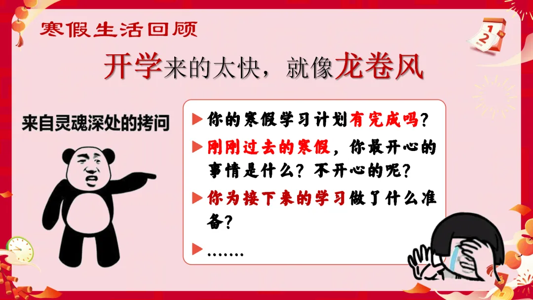 本次教学活动是针对初二学生的春季开学第一课,旨在帮助学生在新学期伊始快速收心,明确学习目标,提升自我,并为未来的学习和生活做好充分的准备。初二下学期是初中生涯的关键阶段,学生面临着知识深度巩固、拓展以及为初三冲刺筑牢根基的双重任务。通过这一课,教师希望引导学生树立正确的学习态度,掌握科学的学习方法,培养自律和自信的品质,以应对初二及以后学习生活中的各种挑战。