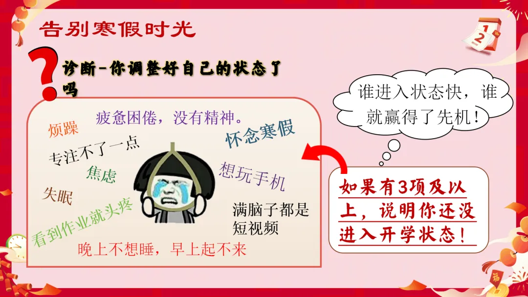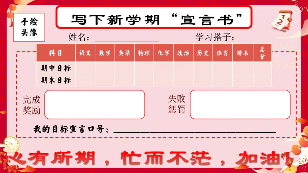 帮助学生迅速从假期状态调整到学习状态,通过自我诊断和调整,使学生能够全身心投入到新学期的学习中。通过设定新学期宣言书,激发学生的学习动力和积极性。