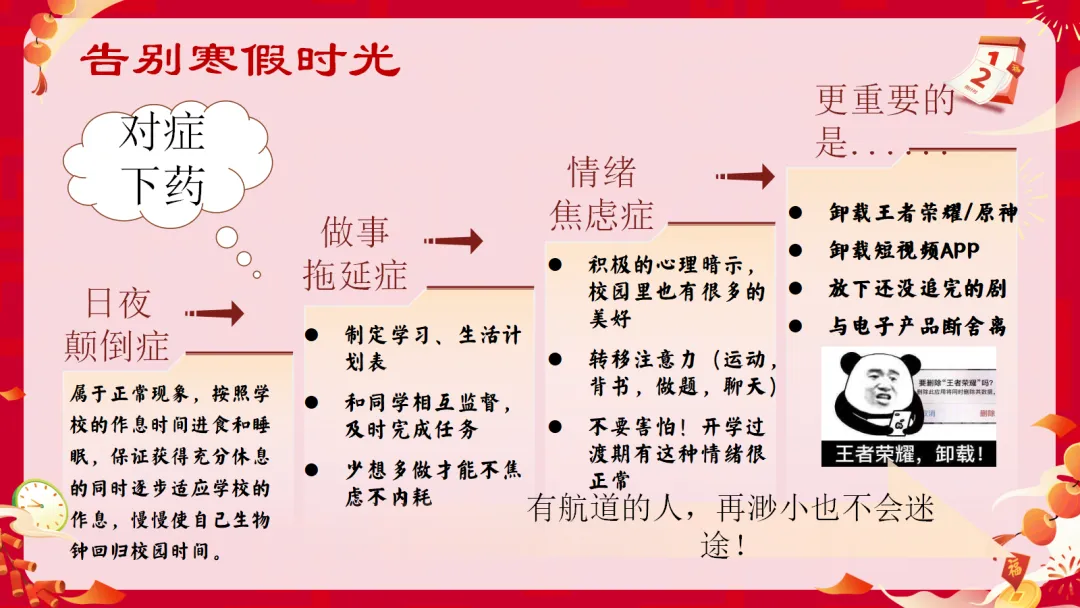 情绪焦虑症:积极的心理暗示,校园里也有很多的美好;转移注意力(运动,背书,做题,聊天);不要害怕!开学过渡期有这种情绪很正常。