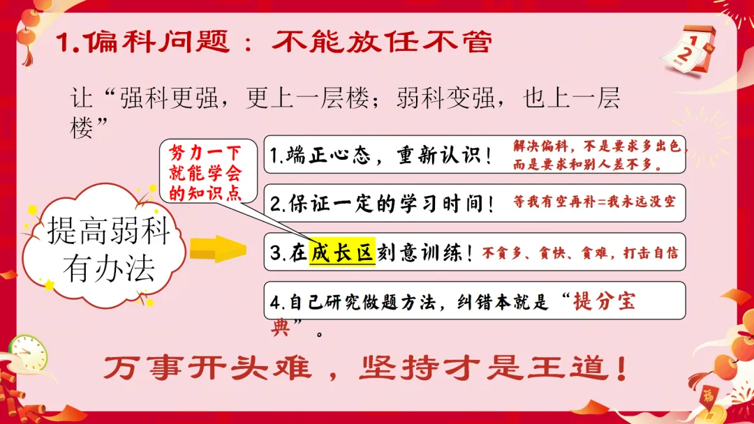 04弱科突破,高二必须要完成——①一定要坚持,满怀热情的坚持;②方法要对,针对性最重要;③各个击破,把大目标瓦解成几个小目标,减轻压力,更有信心实现目标。
