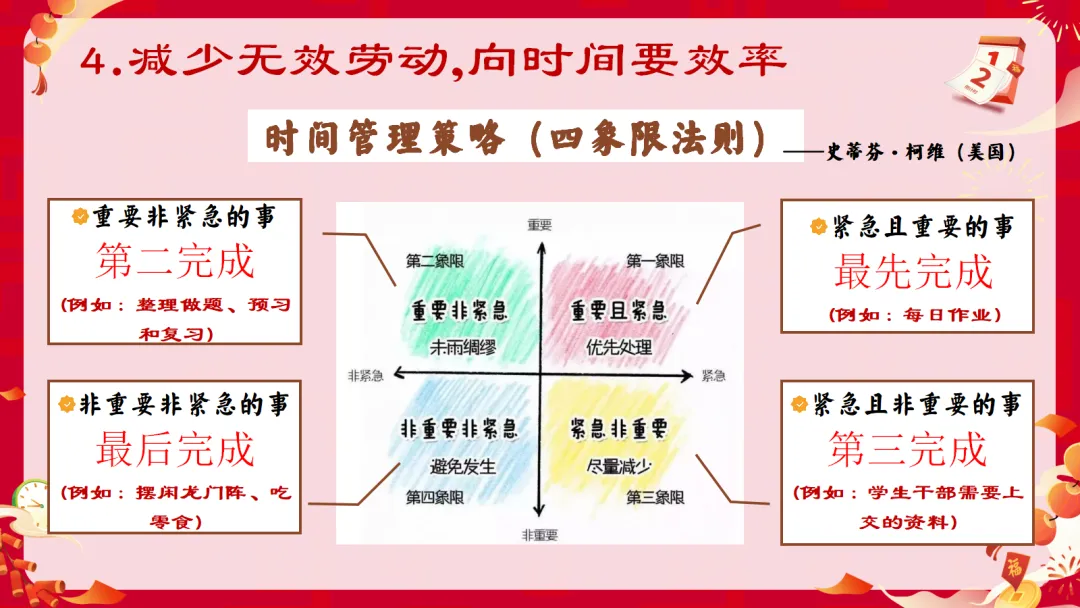 目前,备受推崇的时间管理策略——四象限法则,源自美国著名管理学家史蒂芬·柯维的智慧。该法则倡导我们根据事务的重要性和紧急性两大维度,将日常纷繁复杂的事务精细划分为四大类别。