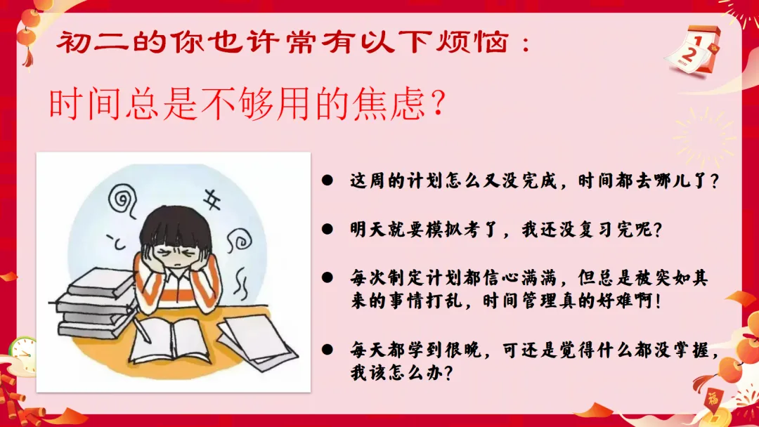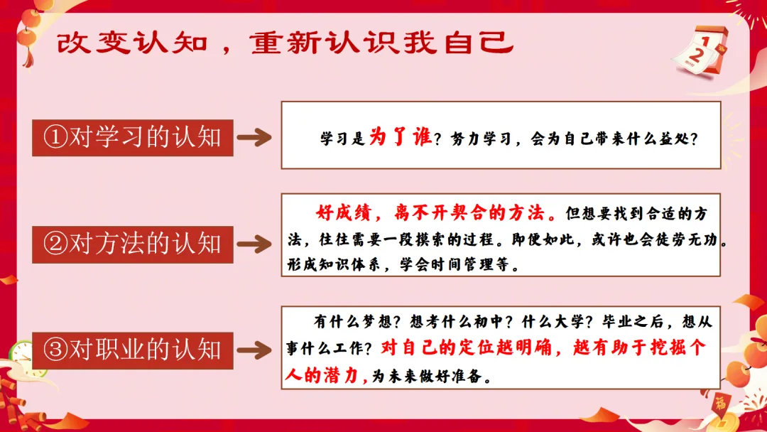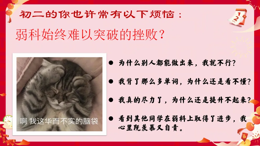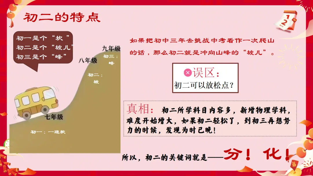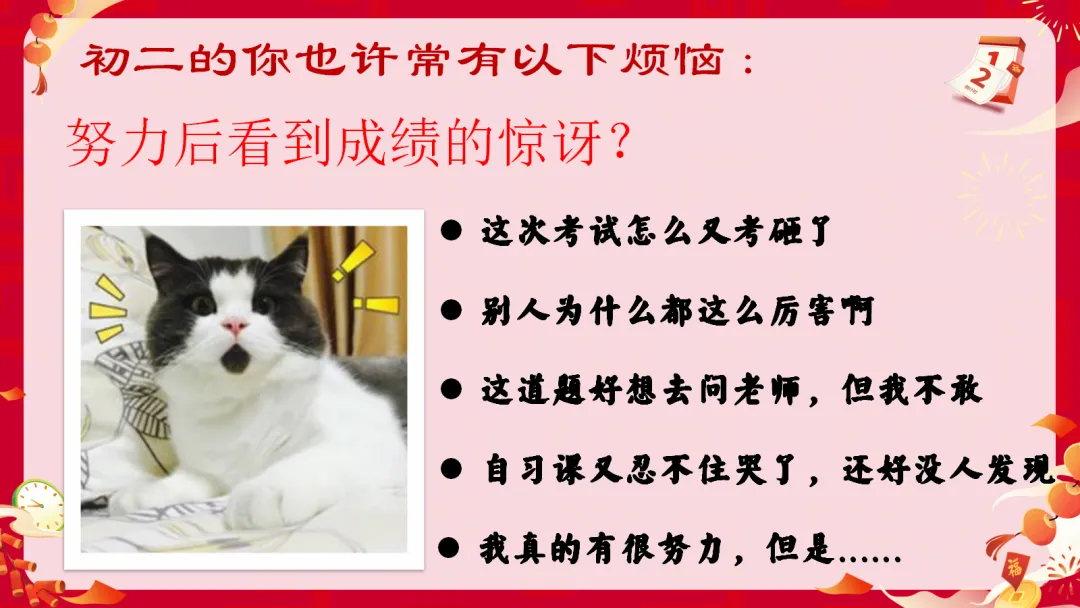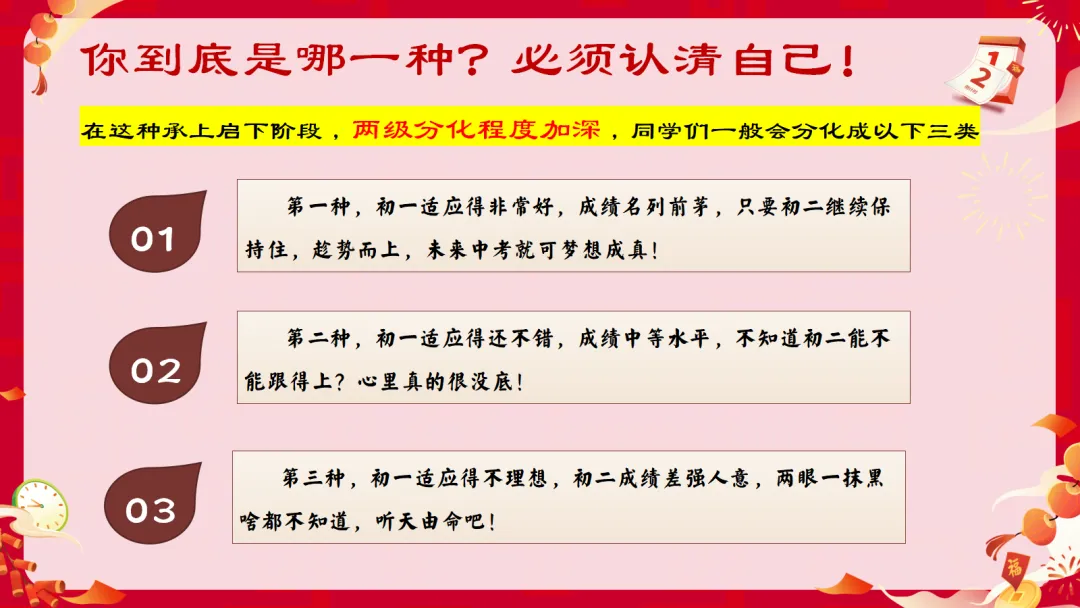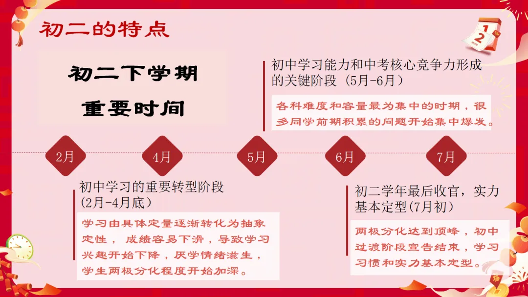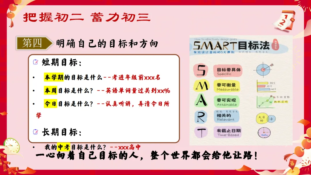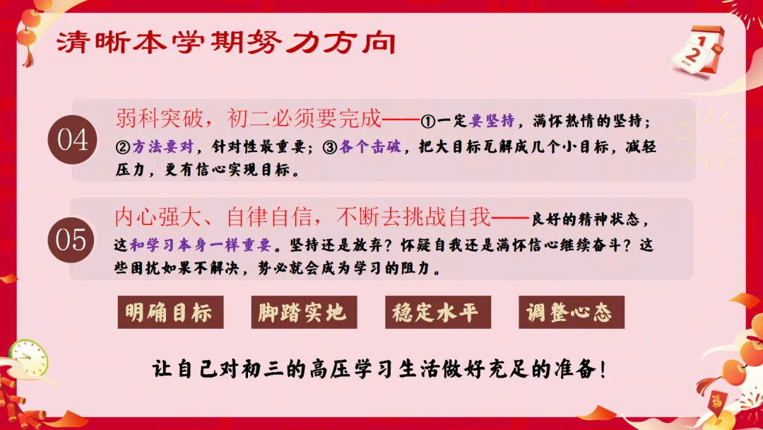 帮助学生清晰认识初二阶段的学习特点和重要性,明确初二的目标和方向。通过引导学生设定短期和长期目标,培养学生的目标意识和规划能力,为未来的中考和高中学习打下坚实的基础。