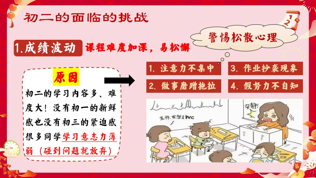 原因:初二的学习内容多、难度大!没有初一的新鲜感也没有初三的紧迫感学生的学习意志力薄弱(碰到问题就放弃)。