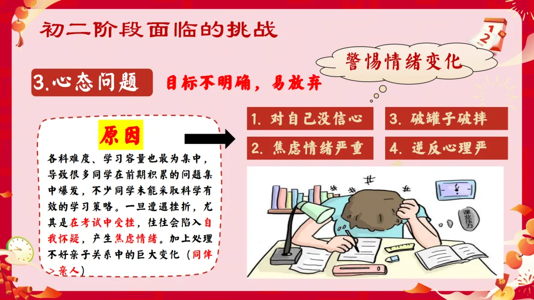 原因:各科难度、学习容量也最为集中,导致很多同学在前期积累的问题集中爆发,不少同学未能采取科学有效的学习策略。一旦遭遇挫折,尤其是在考试中受挫,往往会陷入自我怀疑,产生焦虑情绪。加上处理不好亲子关系中的巨大变化(同伴>亲人)