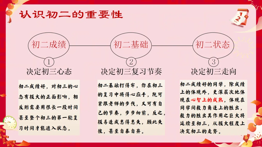 ①初二的成绩将决定初三的心态:初二成绩好,对初三的心态有极大的正面影响,相反则需要用很长一段时间甚至整个初三的第一轮复习时间才能进入状态。