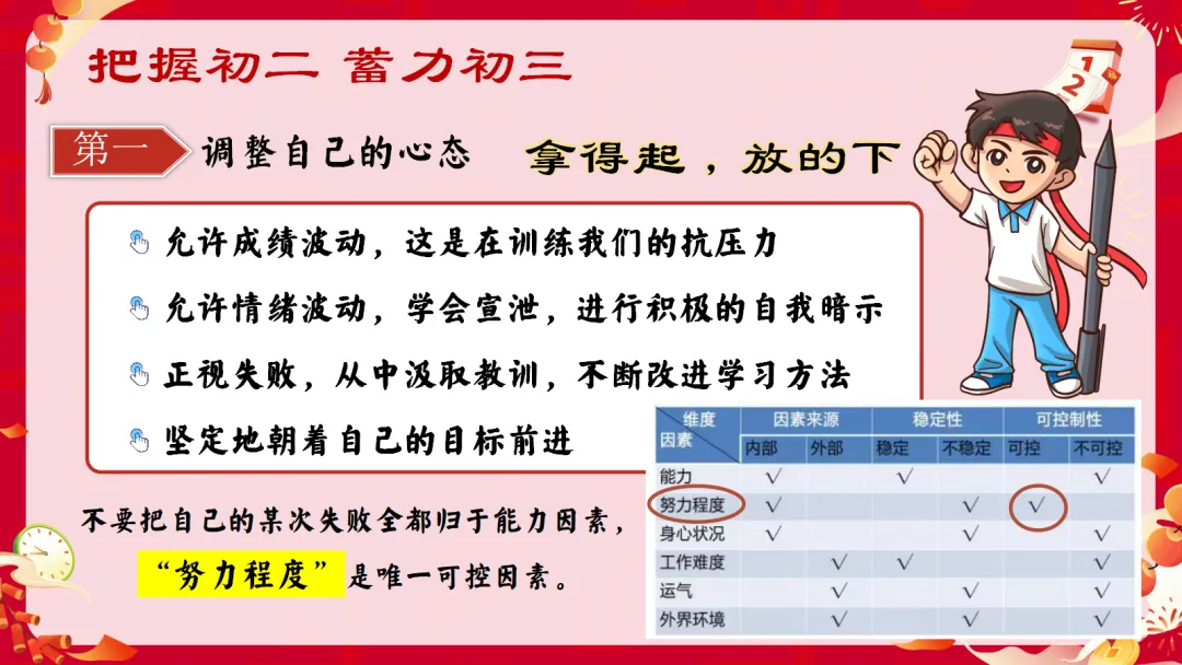 不要把自己的某次失败全都归于能力因素,“努力程度”是唯一可控因素。