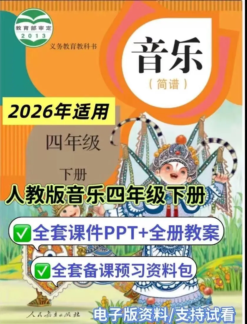 2026春适用人教版音乐四年级下册课件教案备课全套资料包来啦! ️资料包内容包含: 全册课件PPT 全册优质教案 教学设计 音频视频 教学计划 说课稿汇总 ️以上资料都有,有需要的宝子们可联系客服试看哦,合适再下单