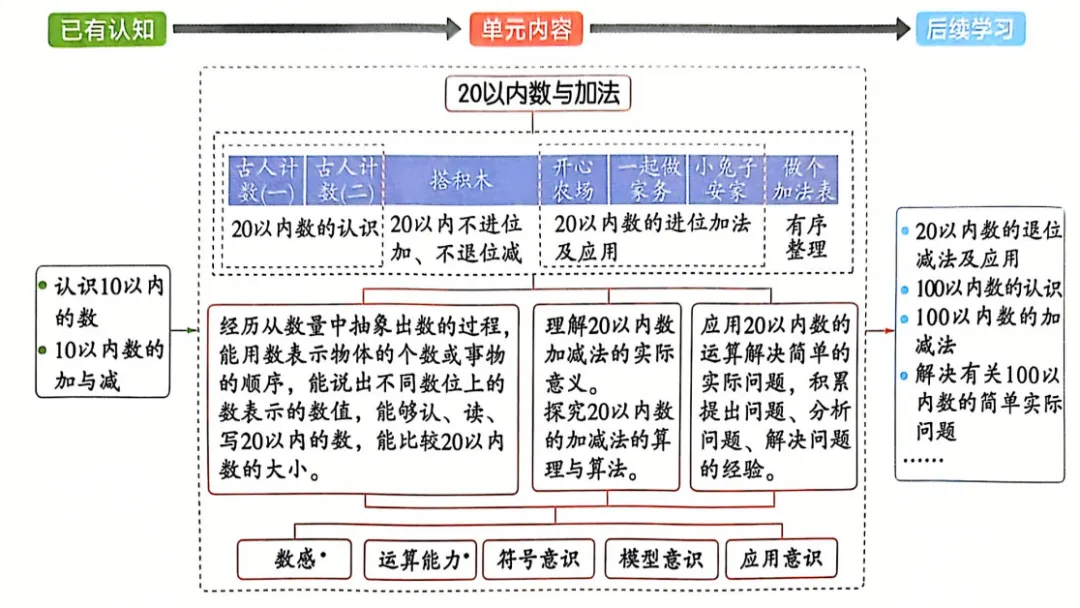 单元整体分析 | 【内容分析】新版北师大数学一年级下册教材2~17页 本单元是在一年级上册10以内数(包括10)的认识和加减法的基础上,借助已有经验,在活动中认识11-20各数,探索20以内数(包括20)的加法和不退位减法,并解决简单的实际问题。本单元学生核心素养的发展重点是数感和运算能力,同时还需要关注学生符号意识的发展。 在数学史上十进位值制的产生经历了漫长的过程,学生对于数位和位值的认识也不是一蹴而就的。为此教科书设计了两节“古人计数”的内容。一是创设了古人牧羊借助石头计数和古人捕鱼借助石头计数的场景,激发学生的学习热情和好奇心。二是精心设计了结构化的问题串,从“用11根散放的小棒表示11-用1捆小棒和1根小棒表示11-用1块大石头和1块小石头表示11-用2块一样的石头表示11”,到用计数器表示11,对比1和10,理解位值,到最后写数,引导学生体会可以用实物、图形和数来表示数量,感受十几的结构特征。在此基础上,学习数的大小比较,帮助学生体会用一一对应的方法既可以数数,也可以比较数的大小。这样的安排符合儿童由直观到抽象的思维发展过程,为后续数与运算、数量关系的学习奠定了基础。 在运算方面,先通过20以内数的不进位加法和不退位减法进一步拓展和丰富对20以内数的认识,再进入进位加法的学习。教科书按“知识结构”基于模型进行了单元课节的整体设计,而非按9加几、8加几、7加几等情况进行课节区分。在结合具体情境解决问题的过程中,教科书利用直观模型,让学生通过操作活动,从不同角度探索计算方法,体会进位加法的算理,丰富对计算方法的认识和理解。例如:“开心农场”一课借助小棒引导学生经历“满十进1”的过程;“一起做家务”一课借助能更好体现“位值”的计数器,让学生体会个位满十时向十位进1,初步感受十进位值制的原理;“小兔子安家”一课借助枝形图、数线让学生尝试用多样化的方法表达对算理和算法的理解,并在计算中发现20以内数的加法算式中的规律。 这种整体设计使学生从一开始就能全面理解进位加法的算理与算法,而不是将注意力集中在加数是几的情况上,有助于简化学习过程,减少记忆负担。学生在面对各种加法问题时通过基于真实数数情境和操作活动的具身学习,能够直接应用加法的基础知识和进位的概念,不断体会相同计数单位的个数相加,“满十进1”的通用规则,实现了数的认识过程与数的运算过程的有机统一,从而更好地理解算理、掌握算法,感受运算方法的多样性及算理与算法的一致性。 【单元学习目标】 1.结合具体情境,经历从数量中抽象出数的过程,能用20以内的数表示物体的个数或事物的顺序,理解十位和个位上的数具有不同的意义,建立数与数位的对应关系,初步感受十进位值制;能认、读、写20以内的数,能比较20以内数的大小,初步发展数感。 2.在丰富的情境中,结合操作活动探索并掌握20以内数的加法和不退位减法的计算方法,理解算理,感悟20以内数的加法运算的本质是相同计数单位个数的累加,经历交流多样化算法的过程,在不同方法的对比中能选择合理的运算策略计算并解释结果的意义与合理性,初步发展运算能力。 3.在解决问题的过程中,不断养成仔细观察、独立思考、认真倾听、有条理地表达的良好学习习惯。 【单元前后联系】 | ||||||||||||||||||