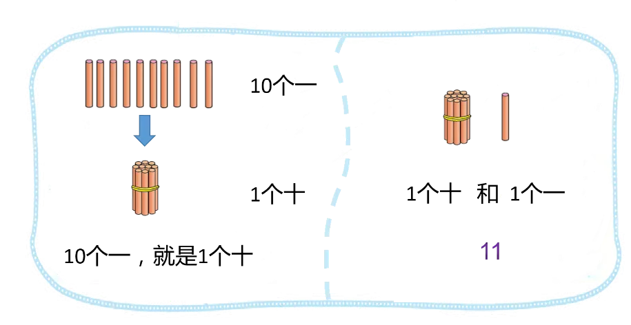 探索新知 | 1.摆一摆,数一数。 师:同学们,你们知道图中一共有多少只羊吗?你是怎么数的? (学生自行摆小棒,再请学生分享) 生:在数羊的数量时,用1根小棒代表1只羊,要一一对应地进行计数。 1,2,3,4,…一共有11根小棒,说明一共有11只羊。 师:这位同学说得很好。用小棒代表羊,摆一摆,数一数,可以做到不遗漏、不重复。 2.捆一捆,认一认(认识“10个一就是1个十”)。 师:1根小棒就表示1个一,那10根小棒表示几个一? 生:10个一。 师:10个一是几? 生:是10。 师:现在老师把这10个一捆成一捆,变成了1个十,这1个十是几? 生:10。 师:10个一是10,1个十也是10,那我们能不能说,10个一就是1个十? 生:能。 师:你们想不想也捆出1个十来?在捆之前,老师想采访一下同学,要捆出1个十,得先怎么做? 生:数出10个一,然后捆起来。