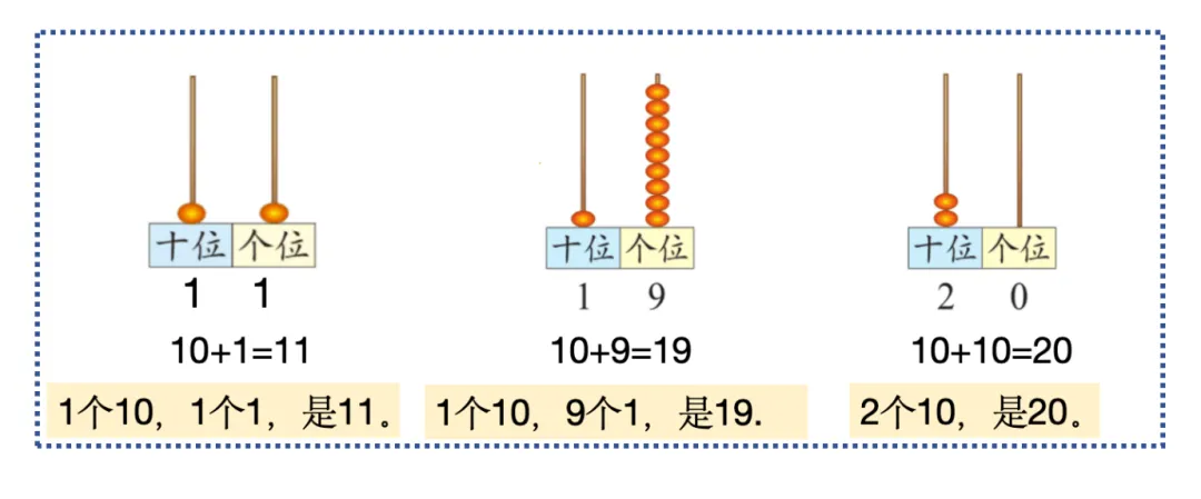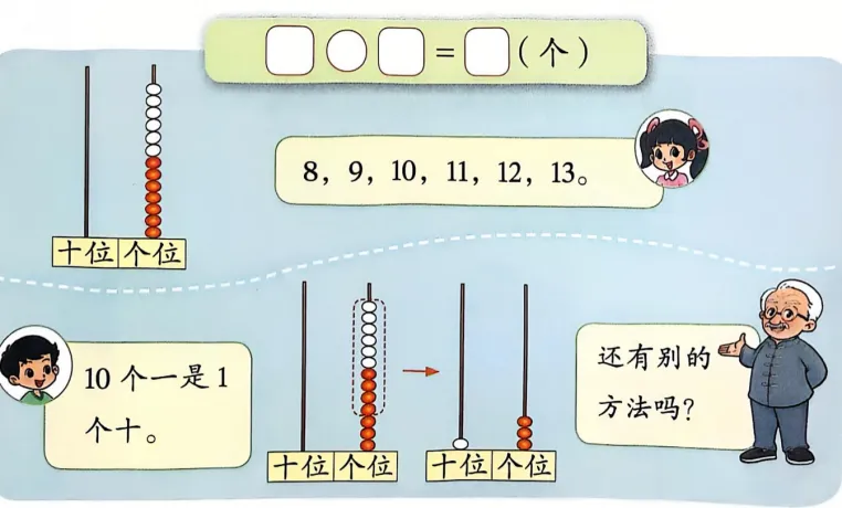 学习目标 | 1.结合实际情境,经历数位产生的过程,理解“满十进1”产生新的计数单位“十”,初步认识个位和十位,理解个位和十位上的数具有不同的意义,建立数与数位的对应关系;能借助计数器、数线等理解和掌握10~20各数的顺序和大小,感受数位、位值的作用,初步发展数感。 2.从借助操作或画图表示数量,过渡到用数学符号表示,能用20以内的数表示数量,知道这些数表达的现实意义;理解位值表示的意义;会用符号比较20以内数的大小,初步发展符号意识。 3.积极参与数学活动,对数学有好奇心和求知欲;初步了解古人发明十进位值制计数法的价值。 | ||