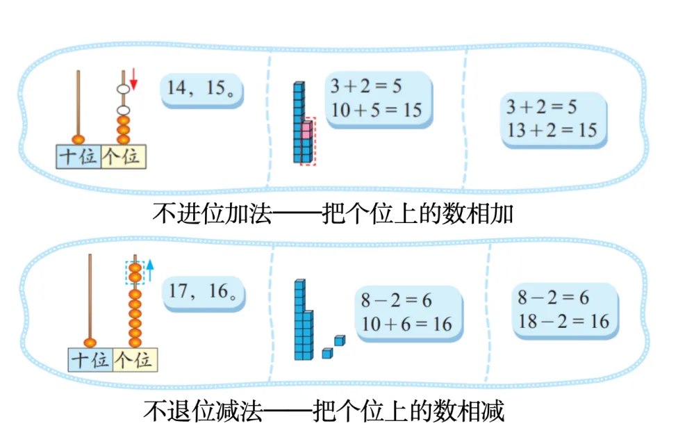 学习重难点 | 1.重点:理解加减法的含义,学会十几加几的不进位加法和十几减几的不退位减法。 2.难点:在学习完“13+2”的计算过程与方法后,学生可以运用刚学完的知识迁移到计算“十几-几”的不退位减法,并运用到实际问题中,发展应用意识 | ||