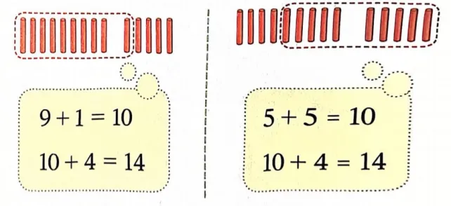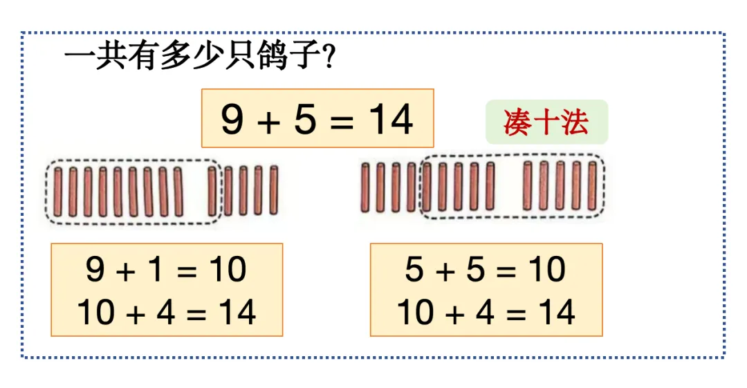 探索新知 | 1.一共有多少只鸽子? 师:请你仔细观察,你能根据鸽子的数学信息,提一个完整的数学问题吗? 生:左边的鸽房里有9只鸽子,右边的鸽房里有5只鸽子,请问一共有几只鸽子? 师:你能根据这个小朋友提出的问题列出算式吗?请写在数学书第8页第一个小橙点处 (学生独立思考,列出算式,并计算) 师:你在算过的过程中有没有疑问呢? 生:我还不会计算9+5=? 师:小朋友们你能用你自己的方法解决这个同学的疑问吗?(可以用自己的小棒摆一摆,说一说) (学生独立思考,举手分享) 生1:可以接着数,从9接着数5个数,9,10,11,12,13,14。所以9+5=14 生2:我用的是数小棒,9只鸽子用9根小棒表示,5只鸽子用5根小棒表示。9个还差一个是10个,所以从5个里面借一个出来,就是9+1=10,10+4=14. 师:还有别的方法吗? 生3:我是用掰手指的方法计算的。我把9记在心里,再伸出5根手指数下去就是14。 师:噢!你是用我们身体上的计算器——手指来帮忙的,哪名同学听清楚了,他的这种方法跟黑板上的哪种方法其实是一样的? 生:接着数 师:你能从5接着数吗? 生:接着数,发现还可以用5去凑十,5+5=10,10+4=14 (教师协助,第二种凑十法,学生不容易想到)