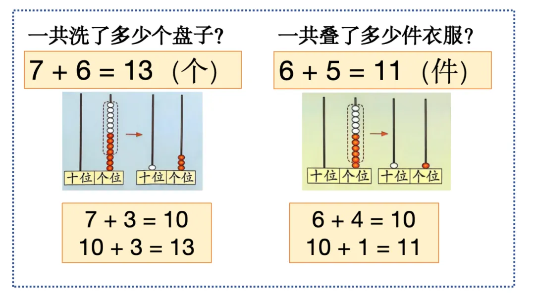 3.多种方法计算。 提问:你还会用哪些方法计算7+6呢? 小组之间交流使用计数器进行计算,然后找学生演示计算的方法,并说出计算的算理。 4、一共叠了多少件衣服 师:7加几、6加几你会计算了,如果5+6你会计算吗?请你试着解决一下“一共叠了多少件衣服”这个问题,再说说你的方法。 学生交流,拨计数器,讨论,并说一说你有什么计算的好方法吗? 生1:我们有很多种方法,首先可以接着数 生2:我是这样想的,5加几可以利用“凑十法” 生3:我认为可以想成9+5,8+5,7+5或6+5的计算完成。 师:小朋友们真会迁移,方法多种多样,看来同学们对进位加法已经掌握得很好了,那你觉得哪种方法最简单呢? 学生各抒己见。 | 让学生巩固加法三句话,进一步理解加法的实际意义并探索进位加法的计算方法。 结合一共洗了多少个盘子的问题,进一步巩固两种凑十法,让学生理解20以内进位加法的算法的多样性。 通过拨计数器探寻本质,让学生在多种方法的讨论中,不断巩固对凑十法的理解和运用。 | |