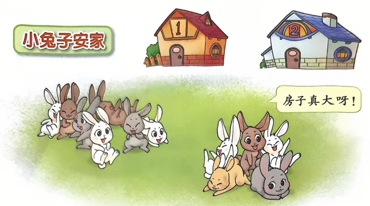 情境引入 | 师:请你观察情境图,你能获得哪些数学信息? 生1:左边有7只兔子,右边有5只兔子。 生2: 有两座房子 生3: 有5只白兔子,3只棕色兔子,3只灰色兔子,1只黄色兔子 | 从小兔子安家的情境图中引入,让学生去发现数学信息,一年级的学生对颜色敏感,生3的预设也是另外的一种角度,教师应给予肯定。 | |