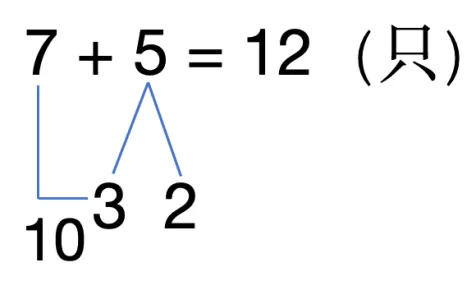 探索新知 | 1.提出问题 师:你能根据这些数学信息,提出一个和小兔子有关的数学问题吗? 生1:一共有多少只小兔子? 师:我们可以怎样列式呢?请你独立思考,把算式写在数学书上。 师:那7+5=?该怎样计算呢,你想用什么方法进行计算?。 2.学生自主探索,交流算法。 同桌两人一组合作交流。 要求:(1)从中选择一种自己喜欢的方法计算。 (2)把自己的计算方法轻声地与同桌说一说,并且边演示边说。 (3)听的小朋友,要竖起耳朵认真听,如果你觉得他说得好,给他鼓鼓掌。 3.全班汇报计算方法。 直观演示学生的计算方法。 老师指名个别学生到前面边口述边演示算的过程。 生:我们看到7,想到3,于是就要把5只兔子分成3只和2只,7只和3只凑成10只,10只再加剩下的2只,等于12只。 谁能看算式把想的过程再说一遍?学生说,老师连线: