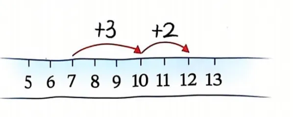 师:为什么要把5分成3和2? 生1:因为7和3能凑成10。 师:你能在直尺数线图上表示这个凑十的过程吗?