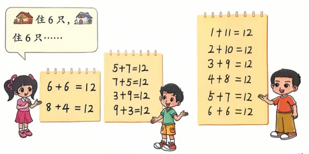 4.给小兔子安家。 提问:我们刚刚解决了一共有几只小兔子的问题,现在有两座房子,你能给小兔子安个家吗,每个房子都可以住小兔子,小兔子们可以怎样住呢? 小组合作讨论,写出算式 全班交流分享。 学生交流讨论,最终写出得数是12的所有加法算式 师:笑笑,淘气,奇思他们也有自己的想法,你能看懂吗?