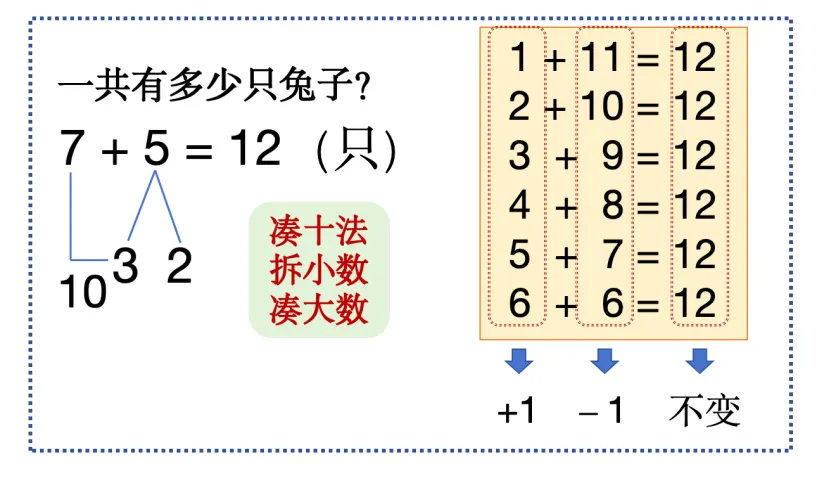 生1:笑笑有两种分法把12只小兔子分成了每个房子6只兔子,还有一个房子8只兔子,一个房子有4只兔子。 师:那淘气的写法,你有什么发现没有? 生:我发现淘气把小兔子分成了5只和7只,可以1号房子住5只,2号房子住7只,也可以1号房子住7只,2号房子住5只。 师:那你看看加数交换了位置,但是我们的得数,也就是和变没变? 生:没变 师:那奇思的算式,你又发现了什么呢? 生:前一个加数加一,后一个加数减一,和不变 师:你们真会观察,有一颗发现数学真理的亮眼睛。 | 让学生巩固加法三句话,进一步理解加法的实际意义并探索进位加法的计算方法。 结合一共多少只兔子的的问题,通过解决7+5=?的真是问题,从20以内进位加法的算法的多样性中,找到最优算法。 通过小兔子安家的真是问题,让学习真实发生,采用小组合作模式去探索,更能促进小朋友们开拓思维,掌握方法。 | |