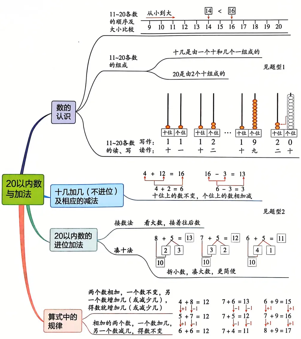 复习重难点 | 掌握20以内数的组成,理解十位和个位表示的意义;系统整理20以内数的加减法。 | ||