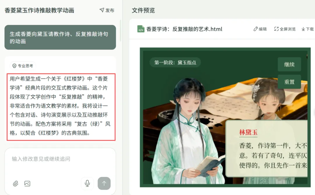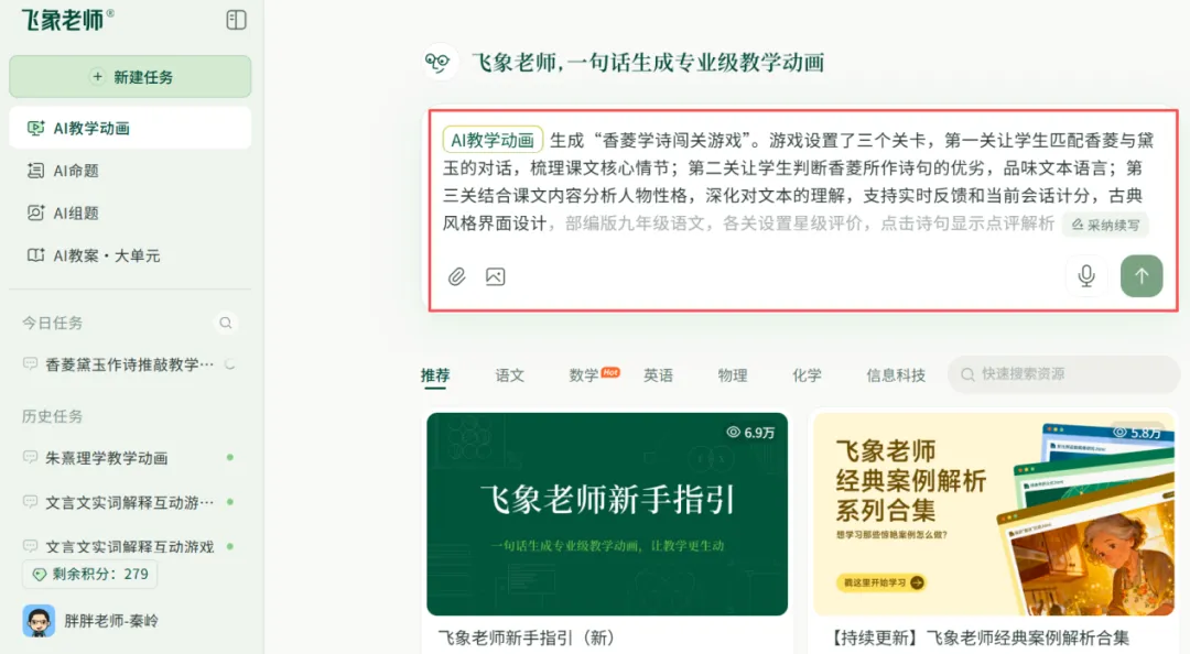 飞象老师的AI动画生成功能,操作起来十分简单,老师们只需输入一句教学相关的描述,系统就能自动生成适配课堂教学的动画短片,把文字难以解释清楚的抽象内容,转化为直观可视的动态画面,大大降低学生的理解难度。在语文教学中,讲解《香菱学诗》这篇课文时,老师们不用再反复拆解文本、讲解人物心理,只需在飞象老师中输入“生成香菱向黛玉请教作诗、反复推敲诗句的动画”,系统就能快速生成人物对话、动作连贯的动画短片。学生通过观看动画,能直观感受到香菱学诗时的专注与执着,也能清晰理解黛玉点拨作诗思路的过程,不用老师过多讲解,就能体会到曹雪芹塑造人物形象的良苦用心,自然而然地感受到古典文学的独特魅力。https://www.feixianglaoshi.com/#/chat?share=1&chatShareId=&communityContentId=5C2B03A7B766C3BCC412AA32991EE04A&featureId=20
