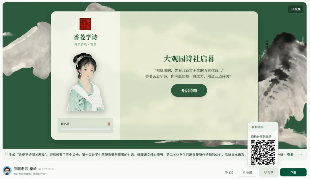 飞象老师的互动课件引擎,是很多一线老师青睐的功能,它能一键将知识点转化为闯关、答题、配对等游戏化的H5课件,让学生在玩游戏的过程中学习知识,大幅提升课堂参与度,也能让枯燥的复习、新知识讲解变得更有吸引力。在《香菱学诗》的教学中,传统的教学方式多是老师分析文本、总结人物特点,学生听得枯燥,理解也只停留在表面。而使用飞象老师,老师们只需导入课文相关知识点,一键就能生成“香菱学诗闯关游戏”。我们还可以进一步明确游戏设计要求:游戏设置了三个关卡,第一关让学生匹配香菱与黛玉的对话,梳理课文核心情节;第二关让学生判断香菱所作诗句的优劣,品味文本语言;第三关结合课文内容分析人物性格,深化对文本的理解。学生在闯关的过程中,既能梳理课文脉络,又能深度感受香菱的好学与黛玉的善教,真正读懂作者塑造人物的匠心,文学素养也在趣味参与中得到提升。https://www.feixianglaoshi.com/#/chat?share=1&chatShareId=&communityContentId=04106B999E56EA901B9DECDE6F1A2664&featureId=20