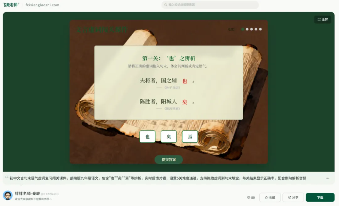 在文言文教学中,句末语气虚词(之、乎、者、也等)的用法零散、容易混淆,学生死记硬背不仅效率低,还容易记混。这时,老师们可以在飞象老师中输入“初中文言句末语气虚词复习闯关课件”,系统就会自动生成分级闯关任务:基础关侧重识别虚词,帮助学生夯实基础;进阶关侧重判断虚词用法,提升学生的应用能力;挑战关结合课文填空,让学生在语境中灵活运用虚词。课件还自带答题反馈和积分奖励机制,学生像玩游戏一样巩固知识,记得更牢、用得更准,彻底告别枯燥的刷题模式。https://www.feixianglaoshi.com/#/chat?share=1&chatShareId=&communityContentId=D6C6C721E1A2A247BD4C6FCC3F3A8D4F&featureId=20