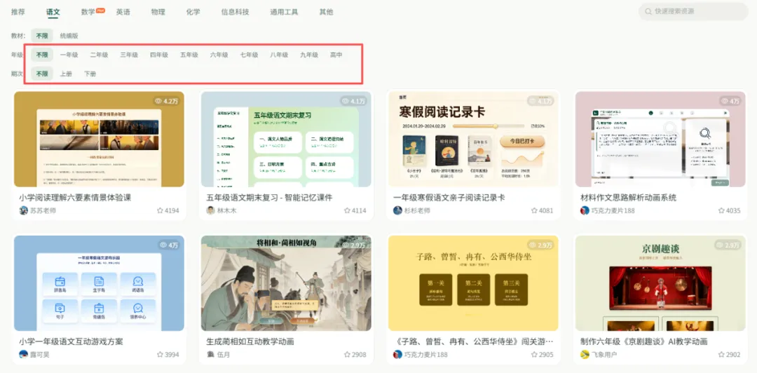 飞象老师的核心优势之一,就是依托10万+一线教师的教学案例进行训练优化,它不是一款通用的AI工具,而是真正贴合教学实际、懂教材、懂课标、懂课堂流程的教学助手。对于刚开始尝试互动教学的老师来说,从零设计课件难度较大。飞象老师考虑到这一点,依托海量教学数据,搭建了分学科、分学段的互动课件案例库。老师们只需输入学科、知识点和年级,就能检索到大量优质的互动课件案例。比如搜索“七年级语文 互动课件”,就能看到文言文、阅读、写作等各类适配的课件模板,老师们可以模仿优秀案例,结合自己的教学实际修改调整,快速形成属于自己的互动课件,大大降低了互动教学的门槛,即使是新手老师也能轻松上手。小结:AI时代教学变革,从教学资源的AI重塑开始