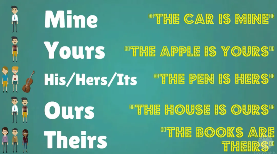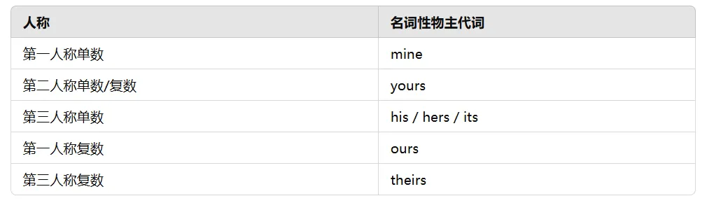 - 名词性物主代词 : The book is ours. (这本书是我们的。)
