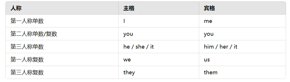 - 宾格 :放在动词或介词后,作为宾语,表示行为的对象。例如: