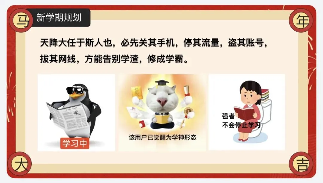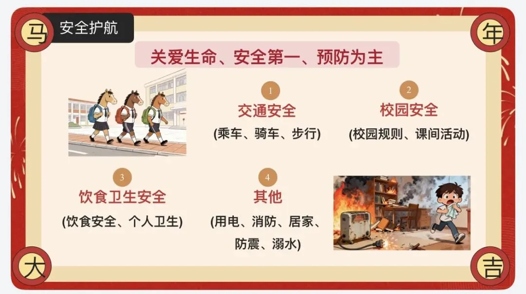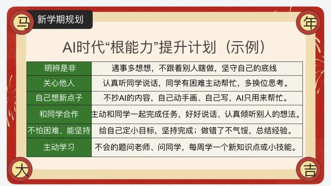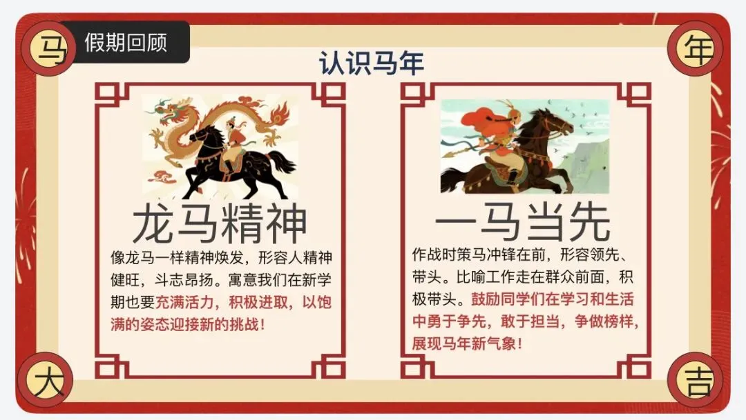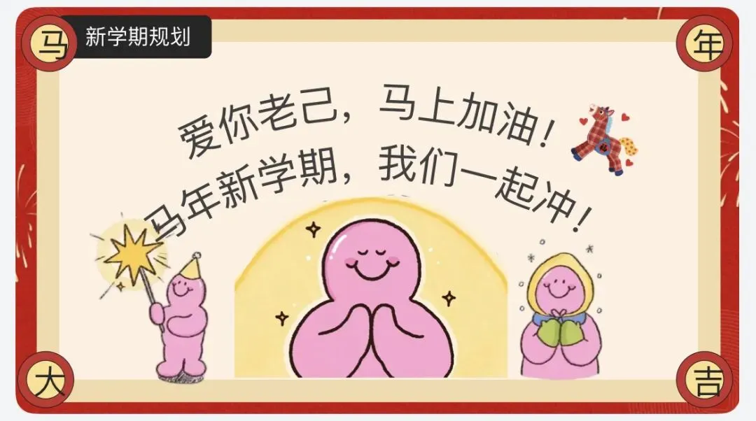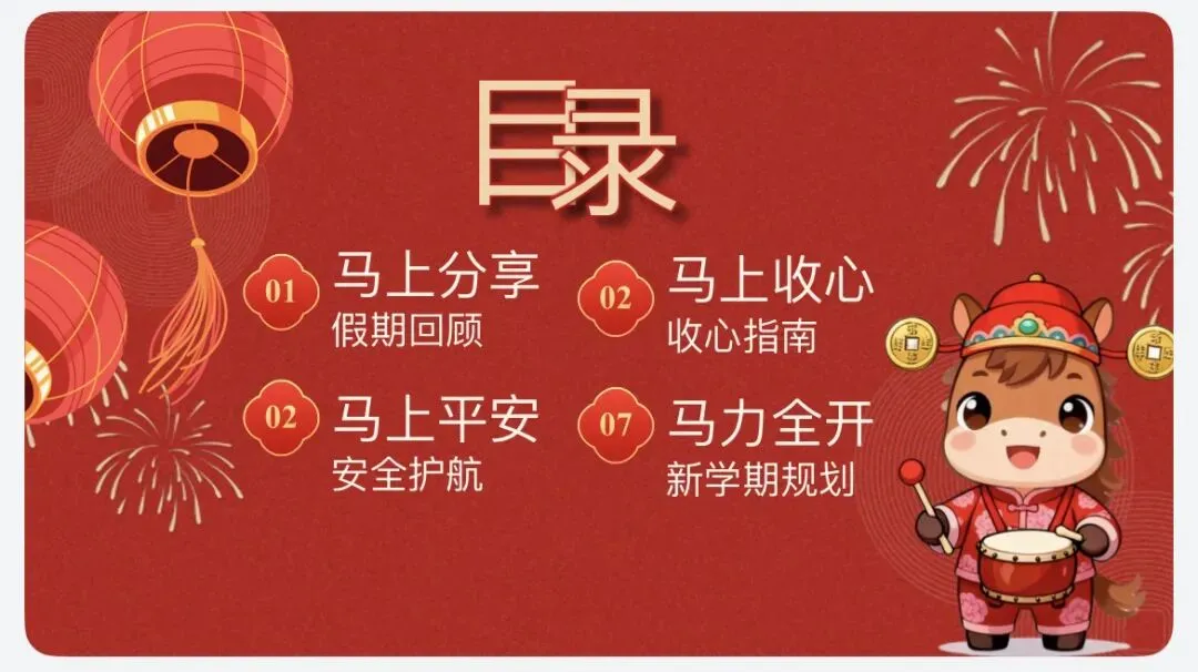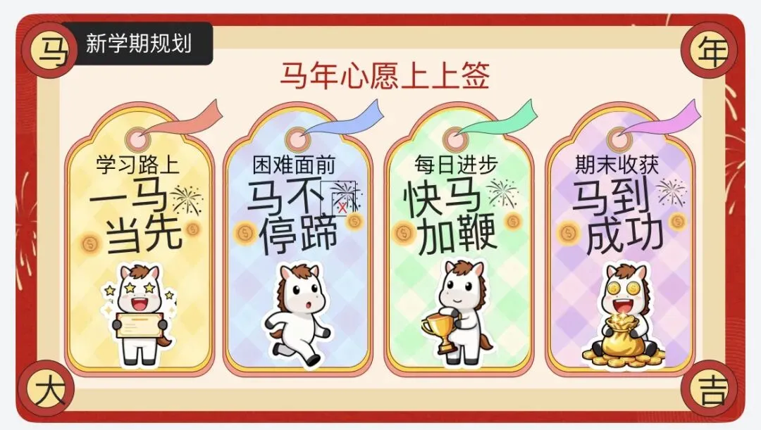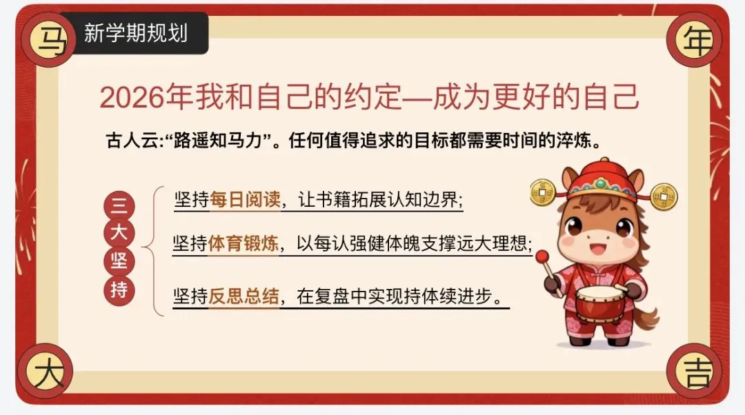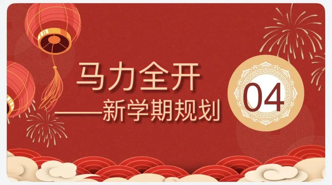 “新学期规划”:在完成了情绪安抚、状态调整和安全教育后,最后用充满喜庆和力量的视觉冲击。引出“新学期规划”的主题。象征着一种仪式感,将学生的注意力从“回顾”和“调整”转向“展望”和“行动”,为新学期的学习任务进行心理赋能。