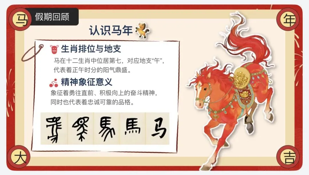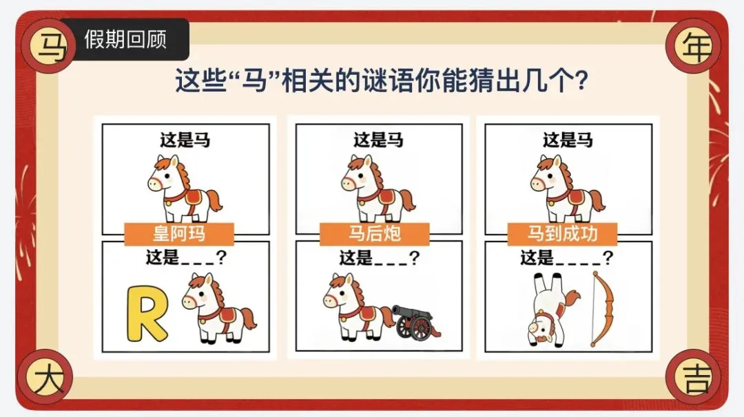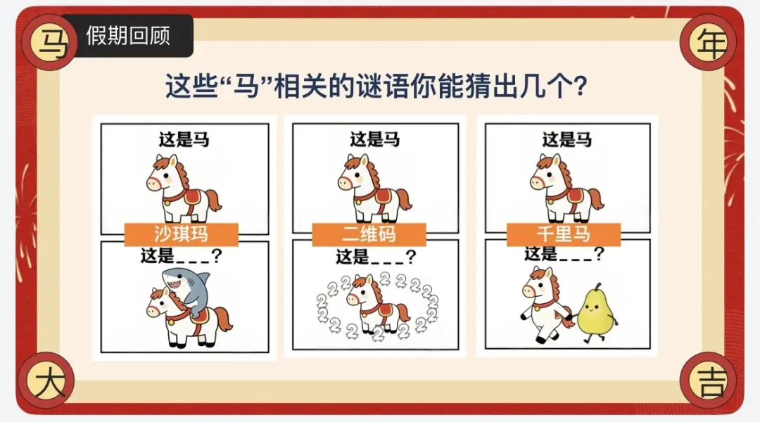 “马”字谜语:用轻松有趣的谐音梗和看图猜谜,瞬间抓住了学生的注意力,笑声能有效化解假期结束的紧张感和陌生感。这是一种心理上的“暖场”,让课堂气氛从松散假期平滑过渡到学习状态,比严肃说教或直接讲题效果更好。
