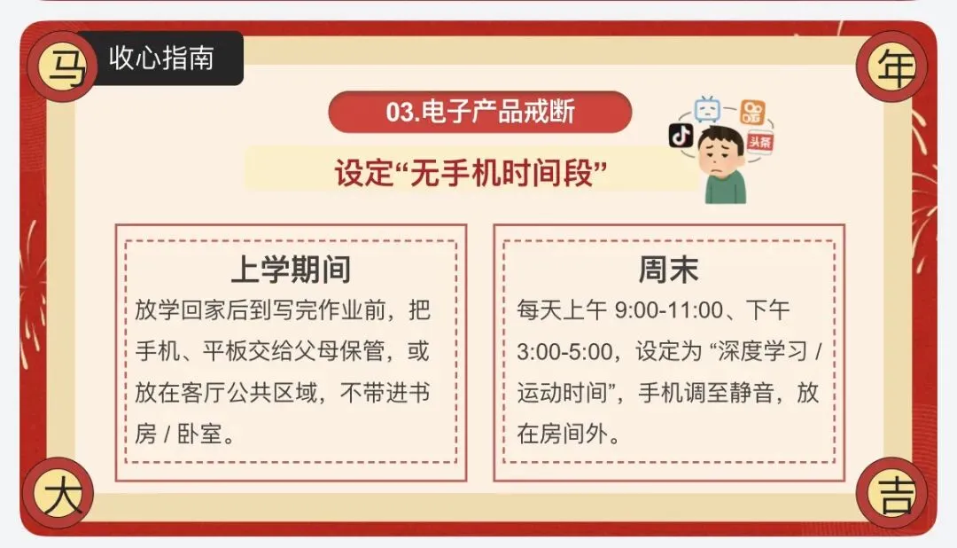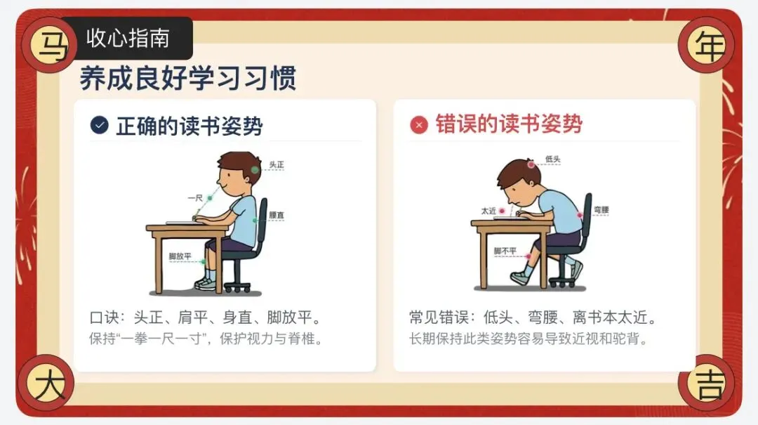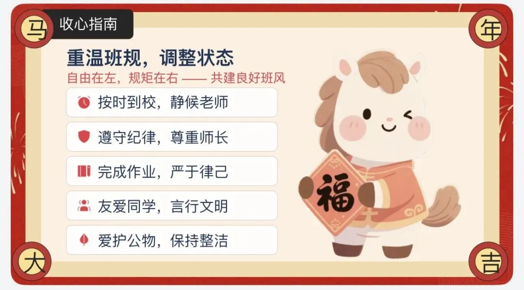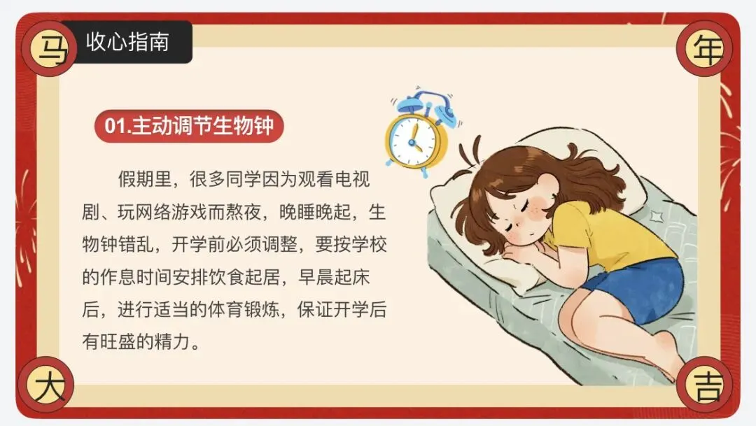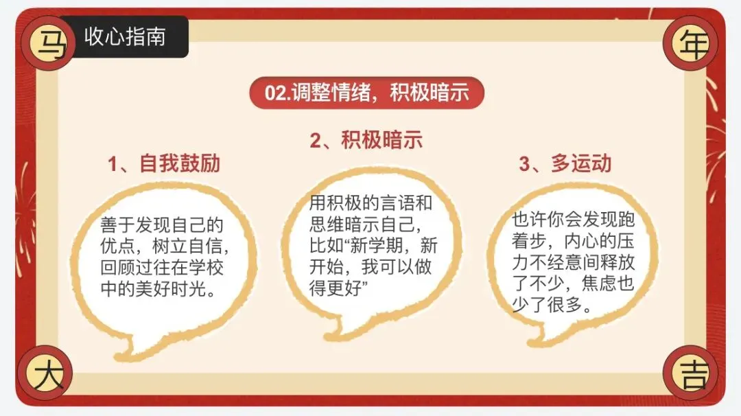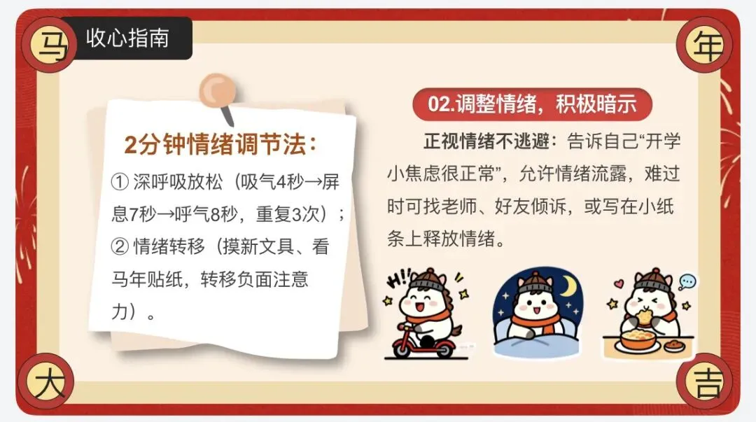 “收心指南”:直接给出了“调节生物钟”和“2分钟情绪调节法”等非常具体、可操作的工具。正视并接纳了“开学焦虑”的普遍性(如提到熬夜、小焦虑很正常),再用科学方法和积极暗示(看马年贴纸)引导学生自我调节。这比直接上课更能解决影响学习效率的实际问题。