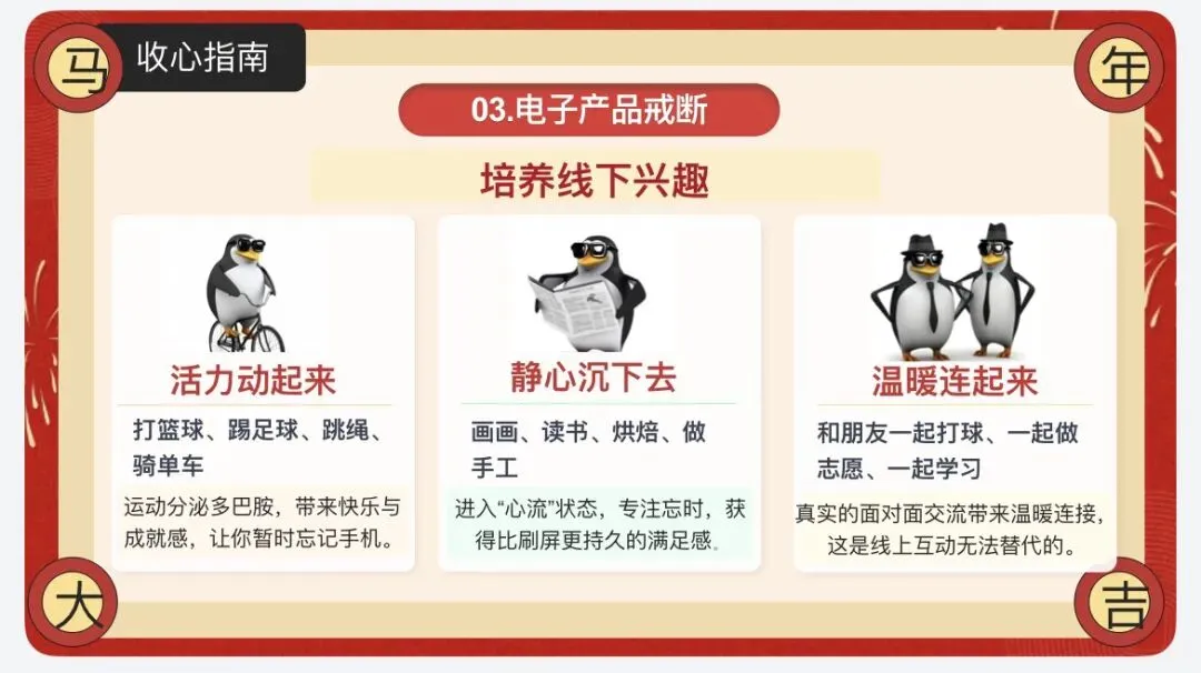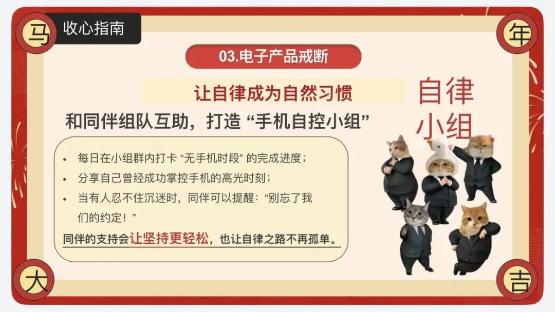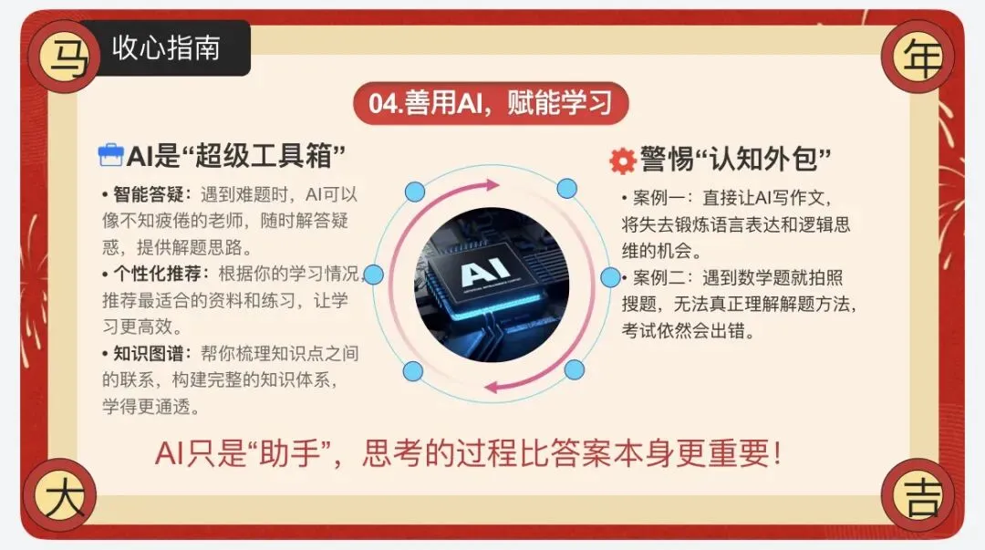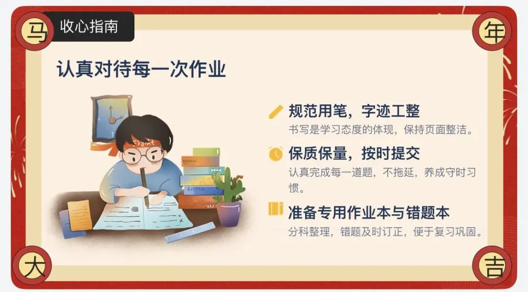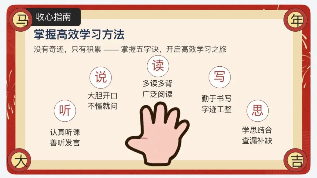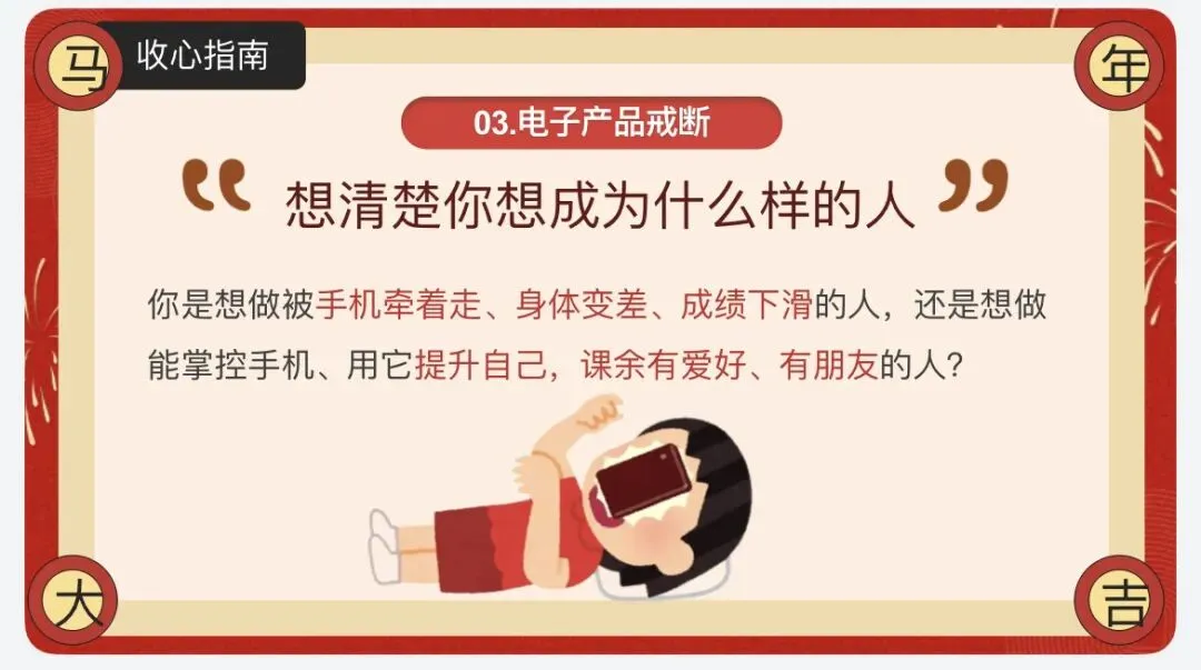 “收心指南”:直接给出了“调节生物钟”和“2分钟情绪调节法”等非常具体、可操作的工具。正视并接纳了“开学焦虑”的普遍性(如提到熬夜、小焦虑很正常),再用科学方法和积极暗示(看马年贴纸)引导学生自我调节。这比直接上课更能解决影响学习效率的实际问题。