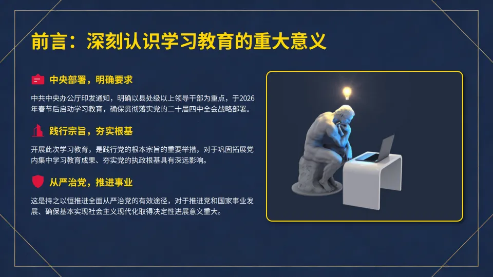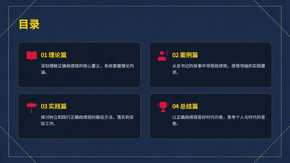 新时代呼唤新担当,新征程需要新作为。让我们以正确的政绩观为指引,努力创造无愧于党、无愧于人民、无愧于时代的新业绩!本专题大纲:ppt68页,讲稿9600字。