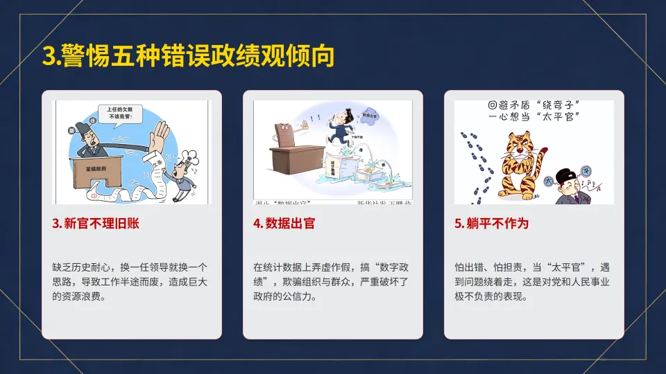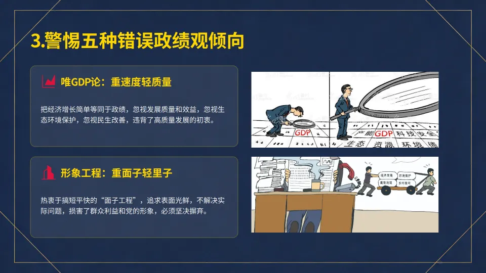 :警惕并反对 “唯 GDP 论”、“形象工程”、“新官不理旧账”、“数据出官”、“躺平不作为” 等五种错误政绩观倾向。