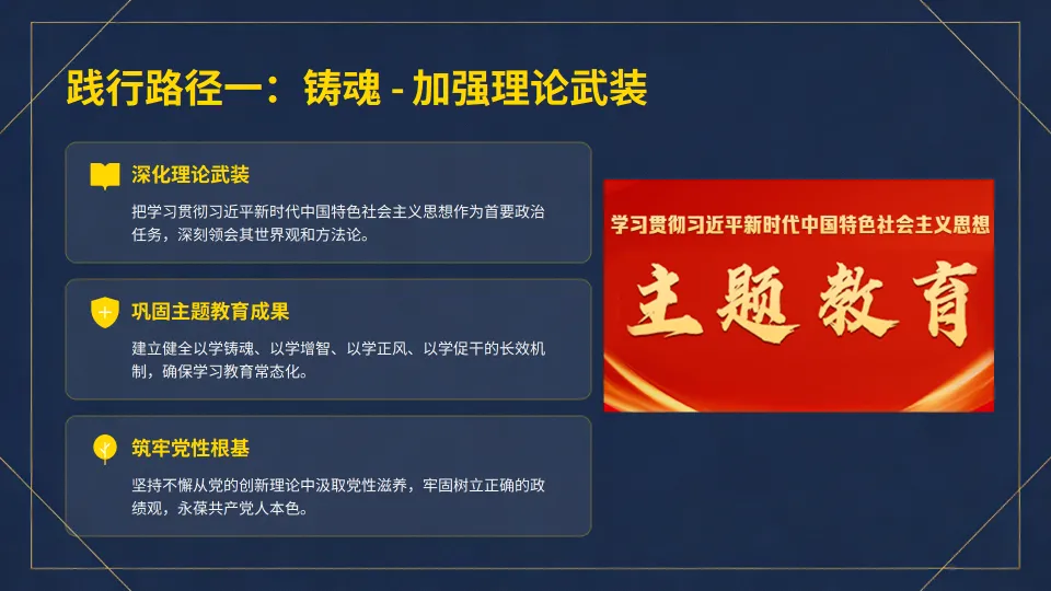 :加强理论武装,用党的创新理论凝心铸魂,筑牢党性根基。