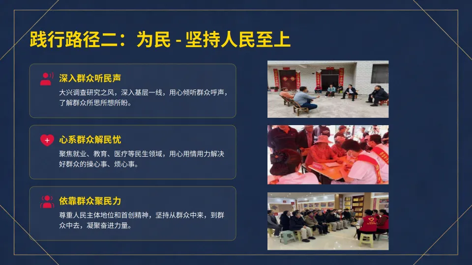 :坚持人民至上,深入群众听民声、心系群众解民忧、依靠群众聚民力。