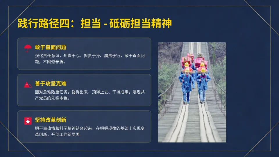 :砥砺担当精神,敢于直面问题、善于攻坚克难、坚持改革创新。