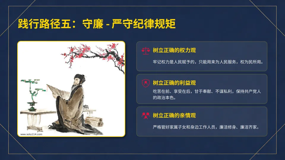 :严守纪律规矩,树立正确的权力观、利益观、亲情观。