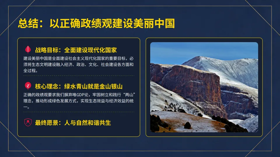 :正确政绩观是美丽中国的 “绿色引擎”,践行 “绿水青山就是金山银山” 理念。
