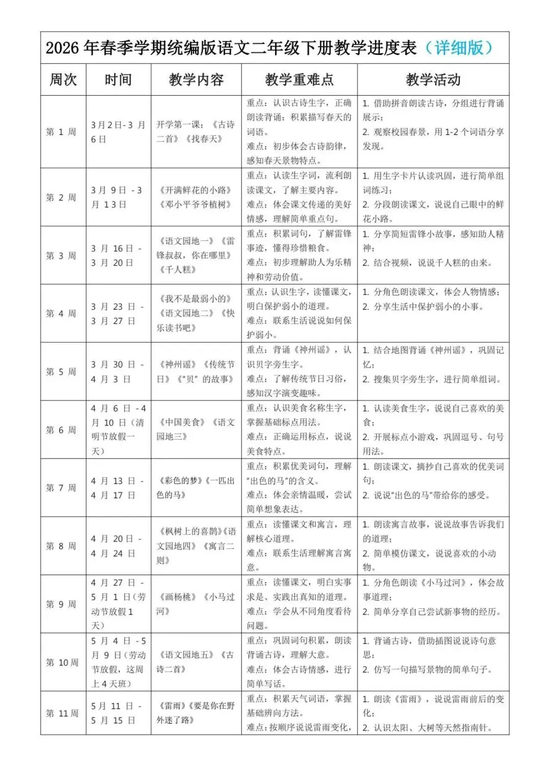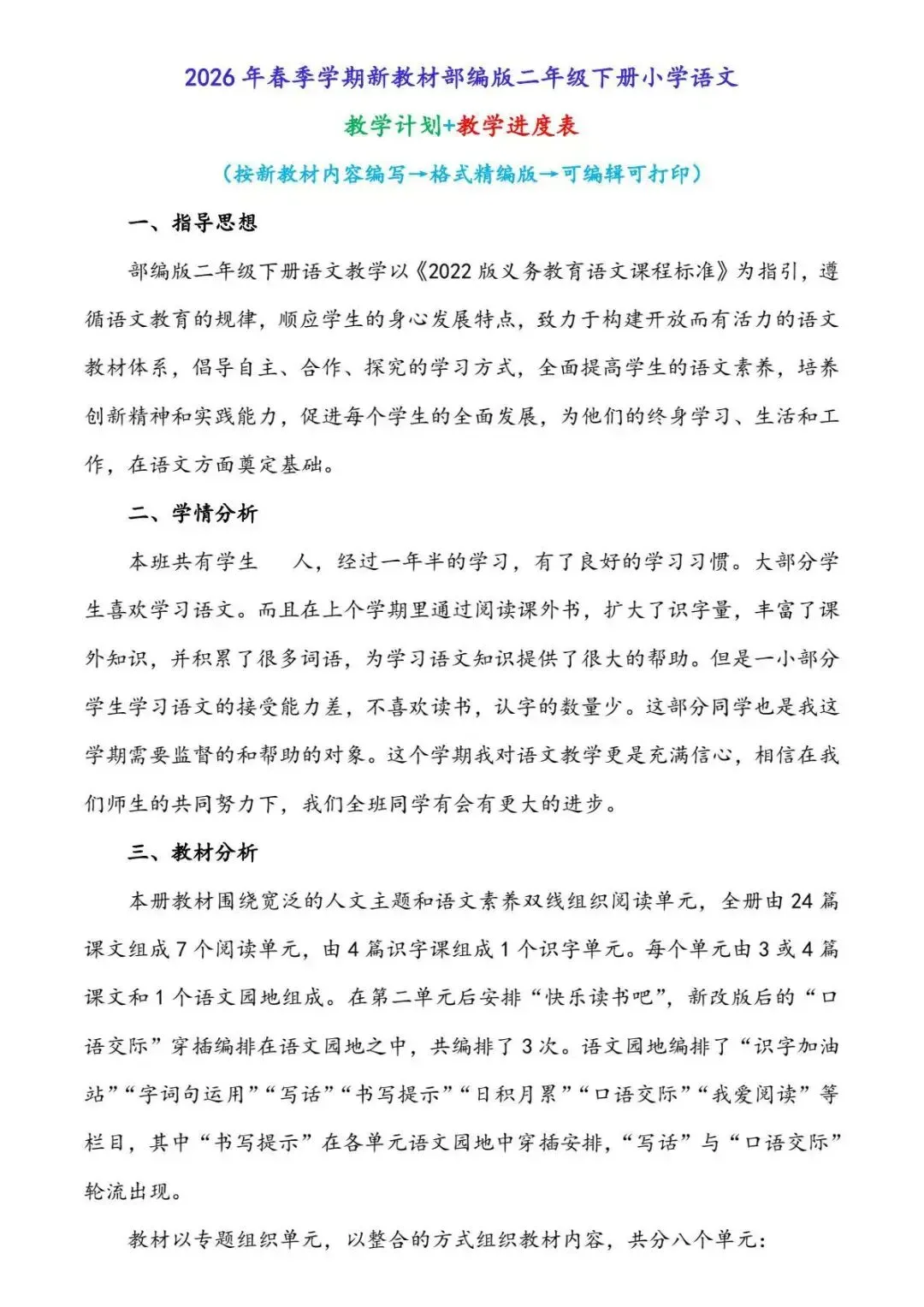 大家好,我是君君妈妈,感谢大家观看我的文章,今日分享2026年春《二年级下册语文课件教案+教学计划+教学进度表合集》根据新版教材内容编写,电子版可编辑可打印。全套资料包持续更新,包括核心素养课件教案、大单元教学课件教案、教学计划、教学进度表等。
