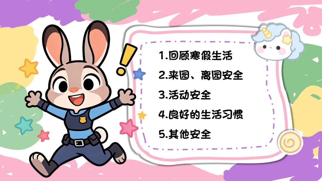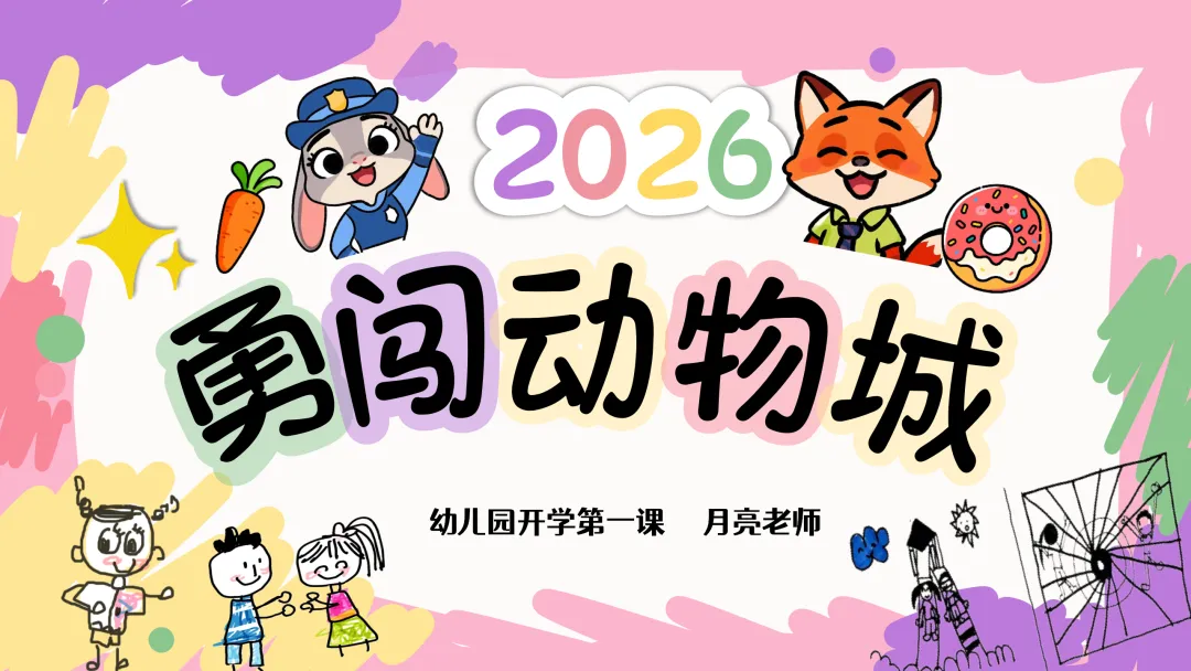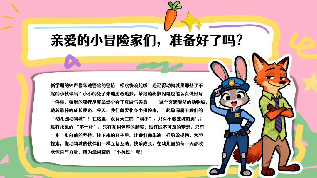 教师以热情的语气问候幼儿:“亲爱的小冒险家们,新学期的钟声像朱迪警官的警笛一样欢快响起啦!欢迎大家回到幼儿园这个快乐的大家庭!”