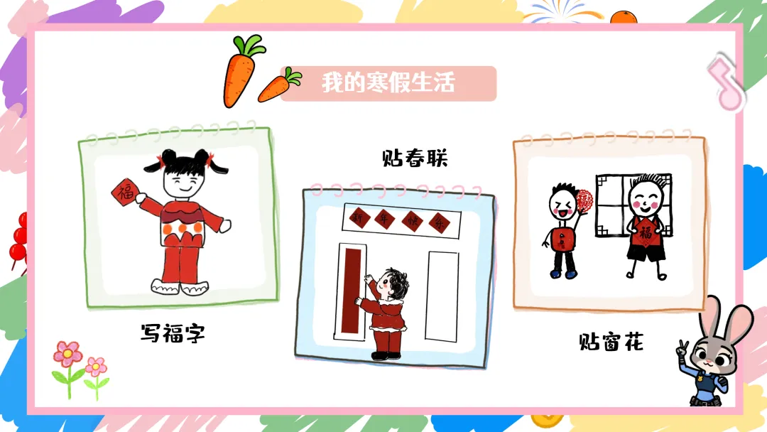 环境布置:在教室墙面张贴动物城角色海报、寒假生活分享栏,营造“勇闯动物城” 的主题氛围。