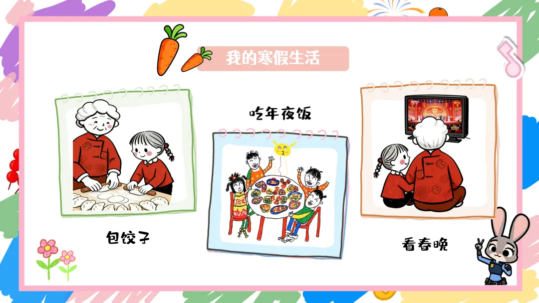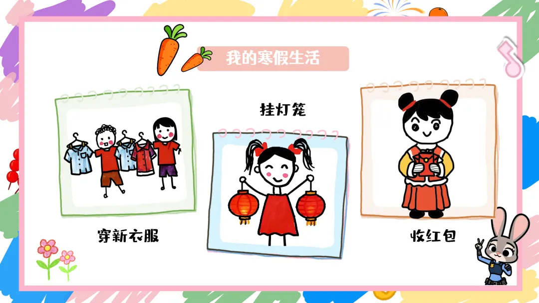 教师引导:“小冒险家们,寒假里你们一定经历了很多有趣的事情,就像在动物城里经历了奇妙的冒险一样。现在,快来和小伙伴们分享一下你的寒假生活吧!”