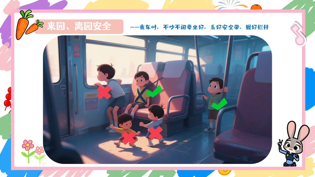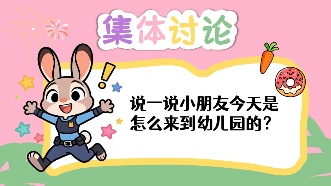 教师提问:“小冒险家们,今天你们是怎么来到幼儿园的呀?” 鼓励幼儿自由发言(走路、乘车等)。