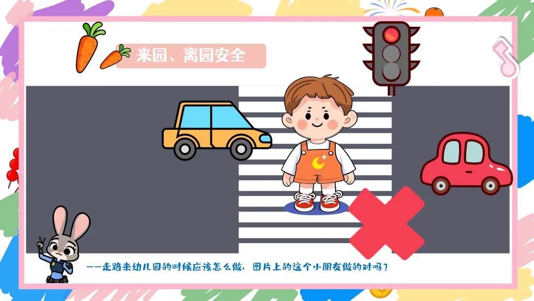 展示走路来园的安全图片,提问:“走路来幼儿园的时候应该怎么做,图片上的小朋友做的对吗?”