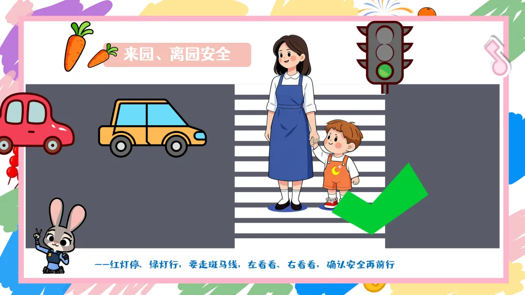 引导幼儿集体讨论,教师总结:“红灯停、绿灯行,要走斑马线,左看看、右看看,确认安全再前行。”
